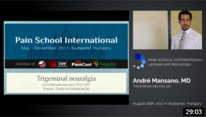 Dr. Andre Mansano gives a detailed slide presentation on trigeminal neuralgia which includes its pathophysiology and anatomy of the nerve and surrounding structures.