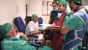 Dr. Gabor Racz evaluates a patient for back and left leg pain, which includes L4-L5 and L5-S1 muscle testing. As a result of the patient’s symptoms and the objective findings, Dr. Racz performs a “Scarring Triangle” procedure followed by a caudal lysis (to target the L-4 nerve root). These are both performed with the guidance of fluoroscopy. He explains the importance of adding a bend to the stylet for precise guidance. He also briefly mentions the injectants and volumes he uses for these procedures.[/vc_column_text][/vc_column][vc_column width=”1/4″][vc_column_text]